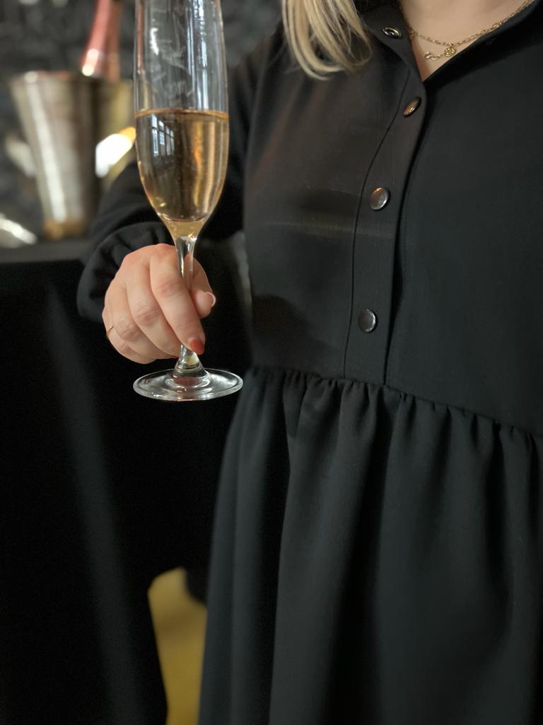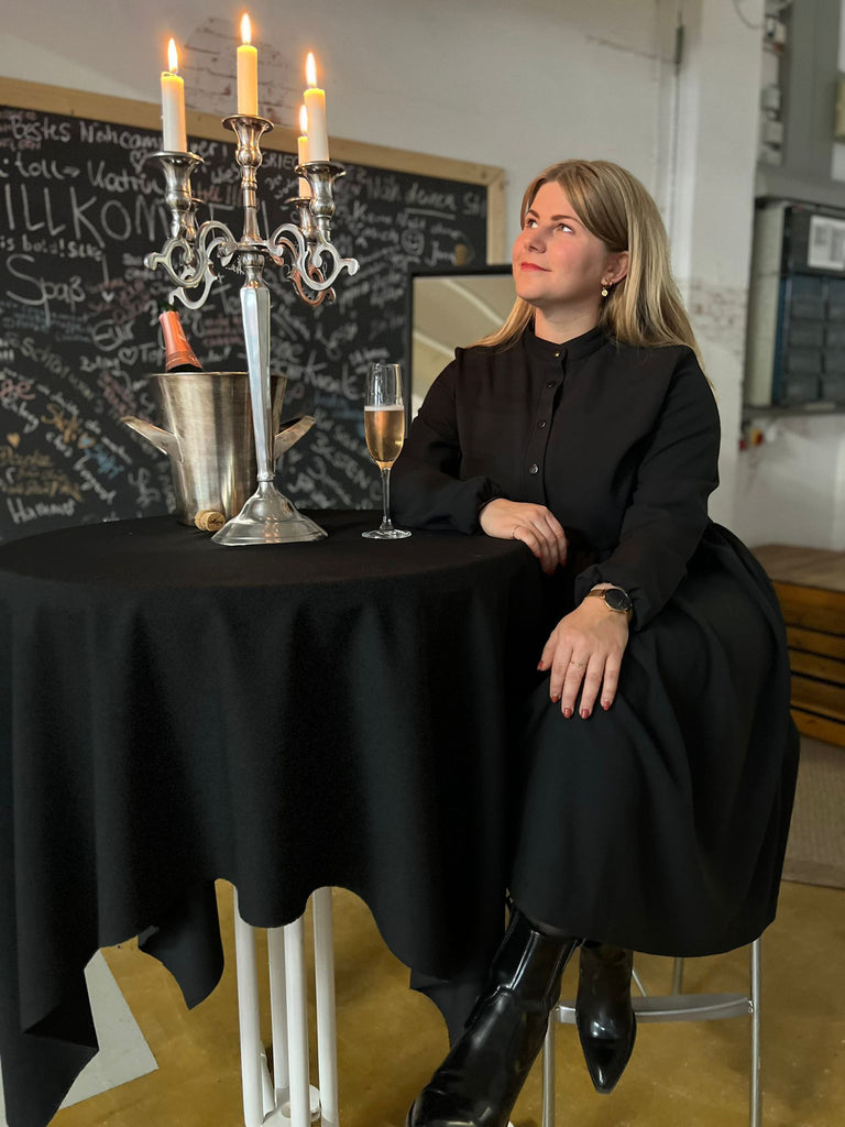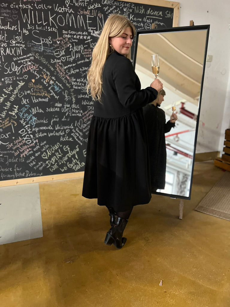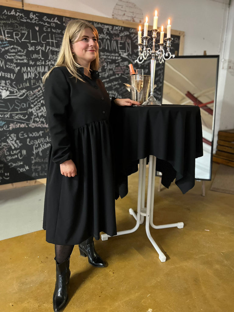 Ines hat sich aus unserem Wollgabardine ein edles und zeitloses Kleid ganz in schwarz gezaubert! Durch den schweren eleganten Fall eignet sich die Ware dafür ausgezeichnet und rundet den Schnitt "Miss Button" ab! Dieses schicke Stöffchen kleidet dich sowohl im Büro als auch zu festlichen Anlässen wunderbar ein! Eins ist klar, die passende Gelegenheit diese hochwertige Ware auszuführen kommt mit Sicherheit!