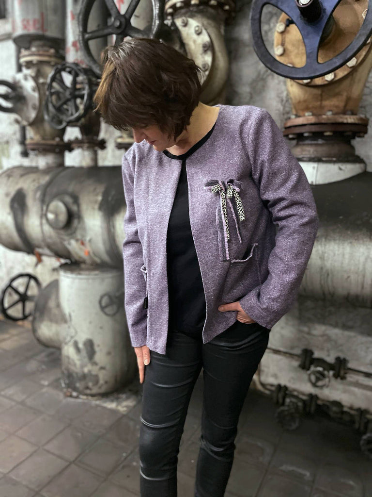 Steffi läutet mit dem pastelligen Farbton 'Malve' den Frühling ein! Ihr Jäckchen ist die kurze Jacke von der Komplizin und perfekt für die anstehende Übergangszeit! Da ihr dieses Modell leider nicht mehr erwerben könnt, empfehlen wir euch das ähnliche Modell '108' aus der Burda 02/2017.