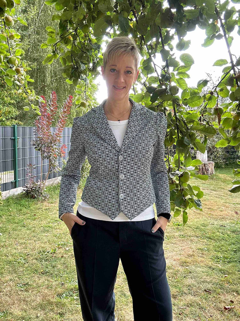 Für die Hose hat sich Nina für ihr Schnittmuster "Schmale Hose" entschieden und der Blazer ist eine Kombi aus ihren Schnitten "Weste" und den Puffärmeln ihres "Blazer 02"