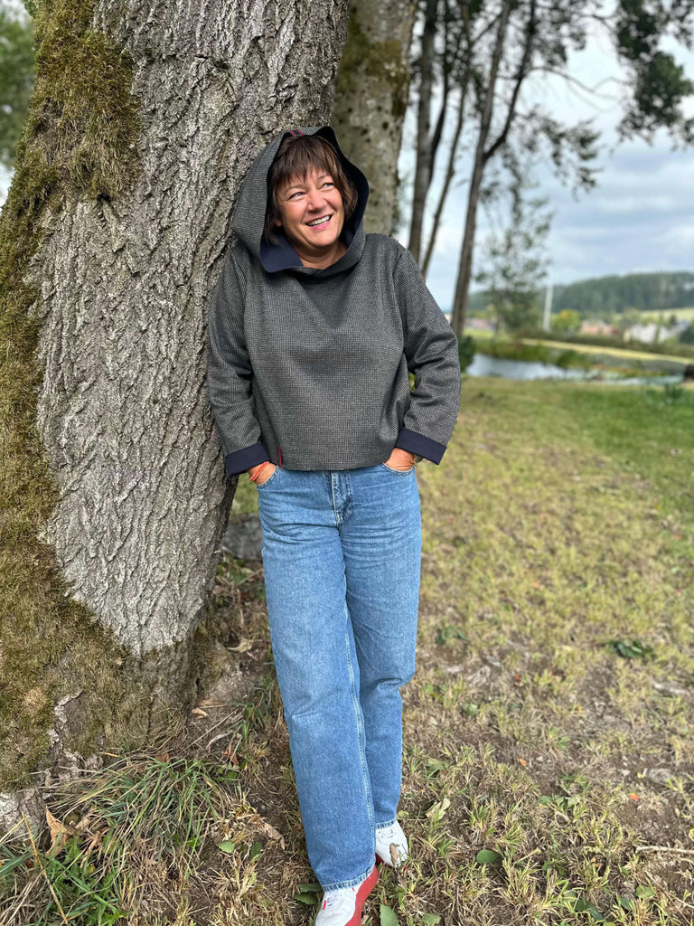 Das trendige große Hahnentrittmuster in Grau/Schwarz auf der einen Seite und eine dezente dunkelblaue Uniseite lassen sich super und easy kombinieren und sorgen dafür, dass deine DIY-Fashion sowohl von innen als auch von außen einen coolen Look erzeugt!