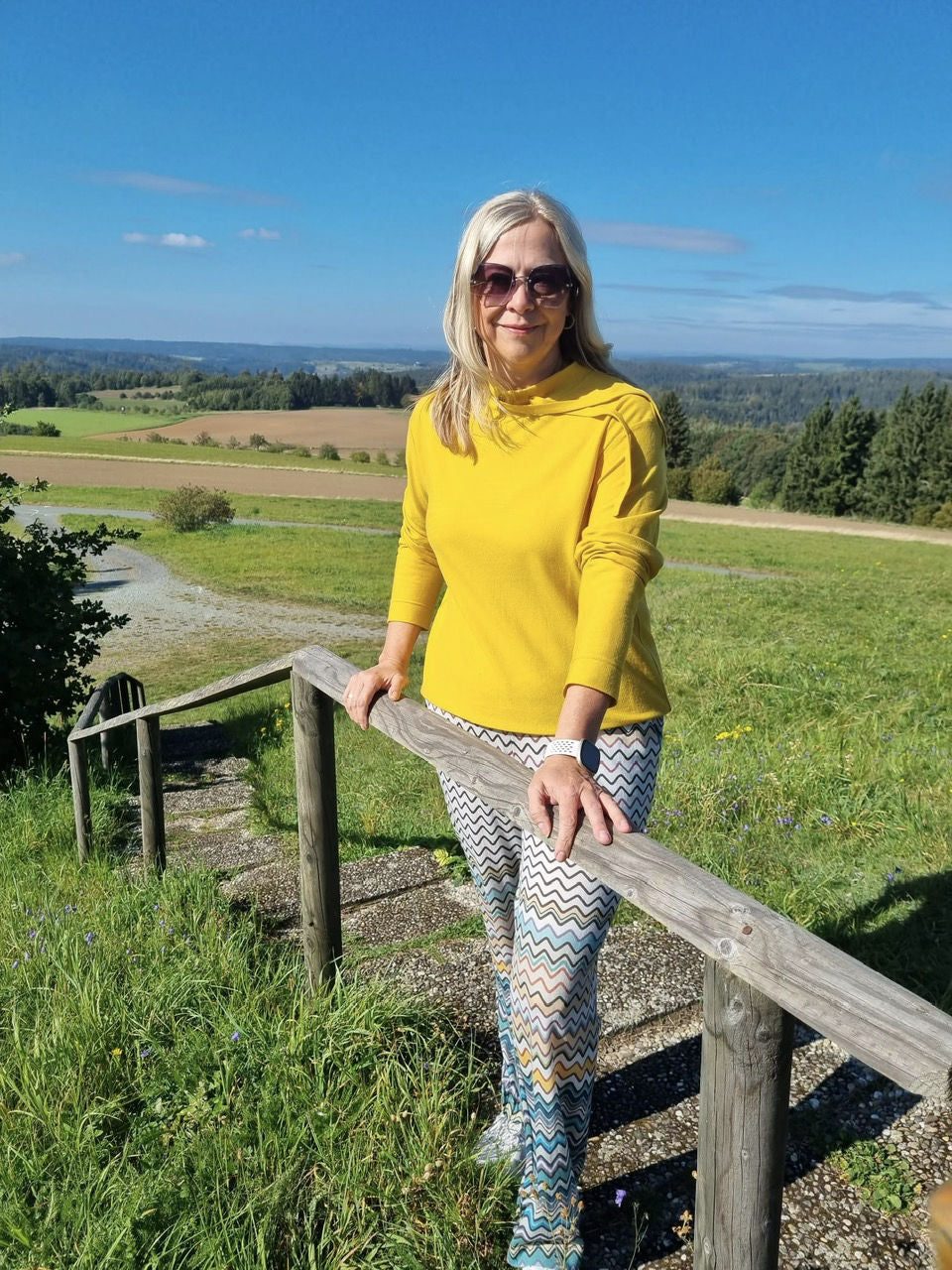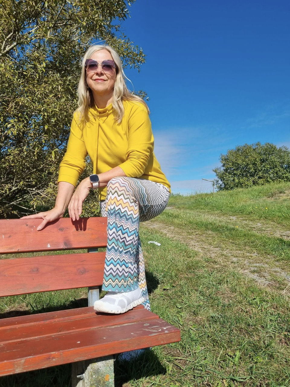 Michaela presents a casual sweater combined with the NXT Merino print "Miss Wave" as pants.