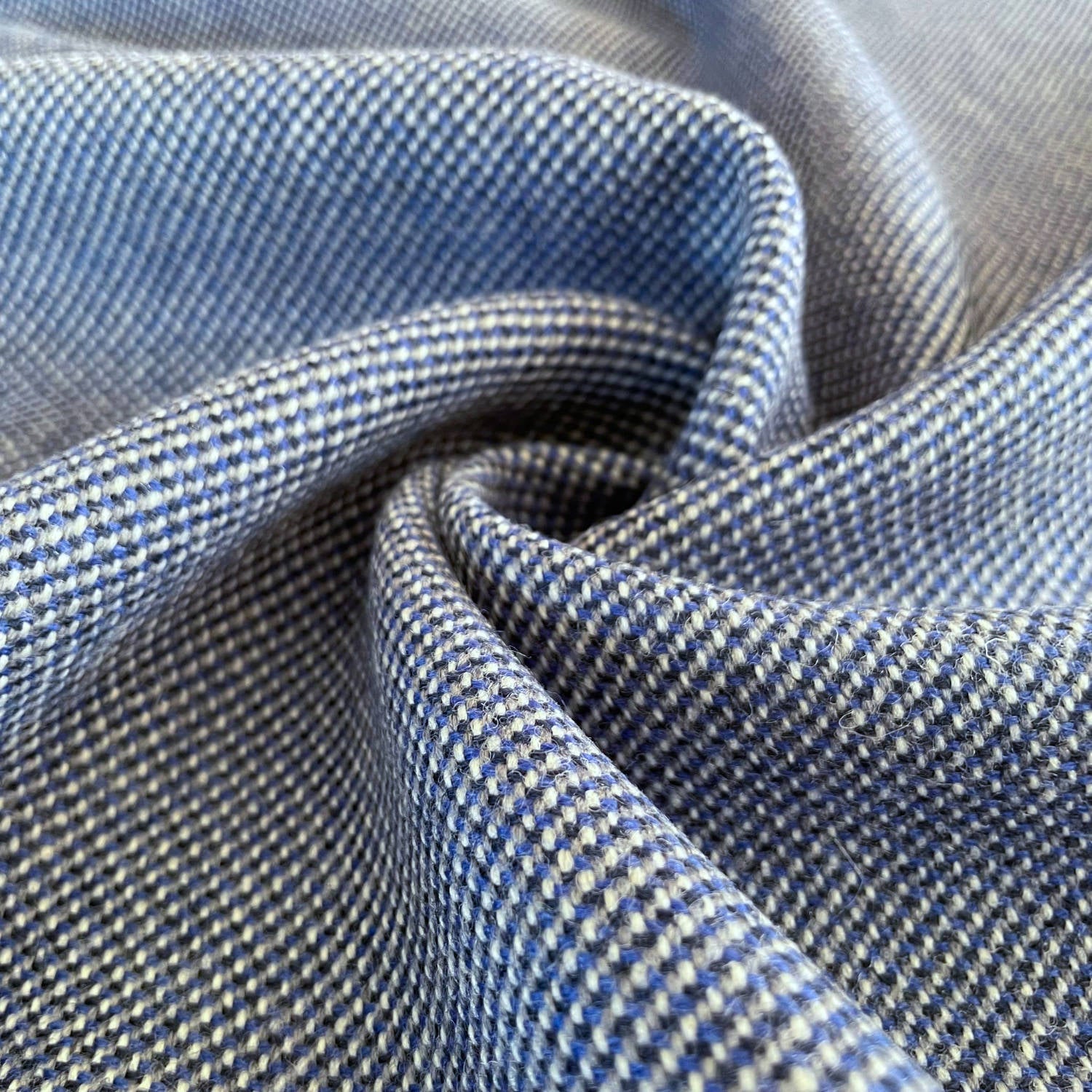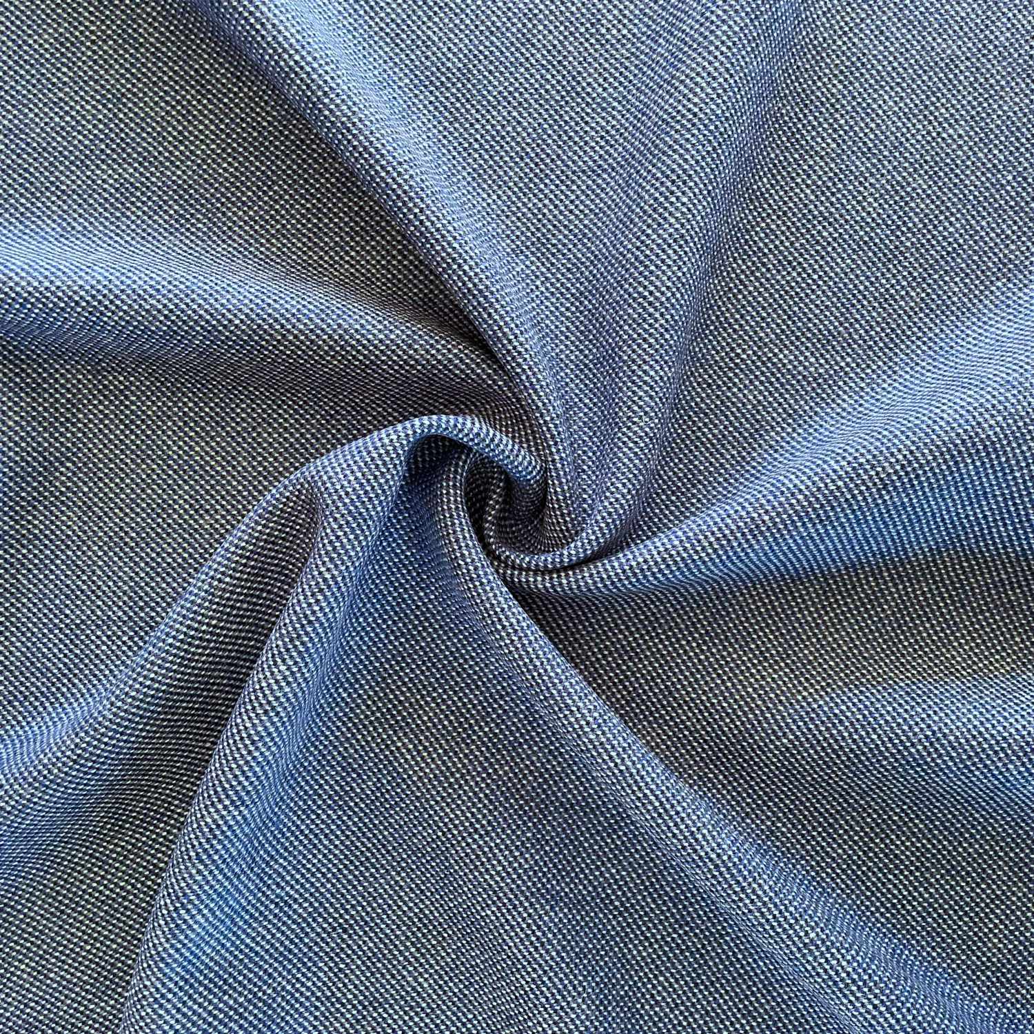 Our high-quality wool fabric in a faux solid color structure in blue/grey is perfect for coats, jackets, blazers, caps, vests or accessories.