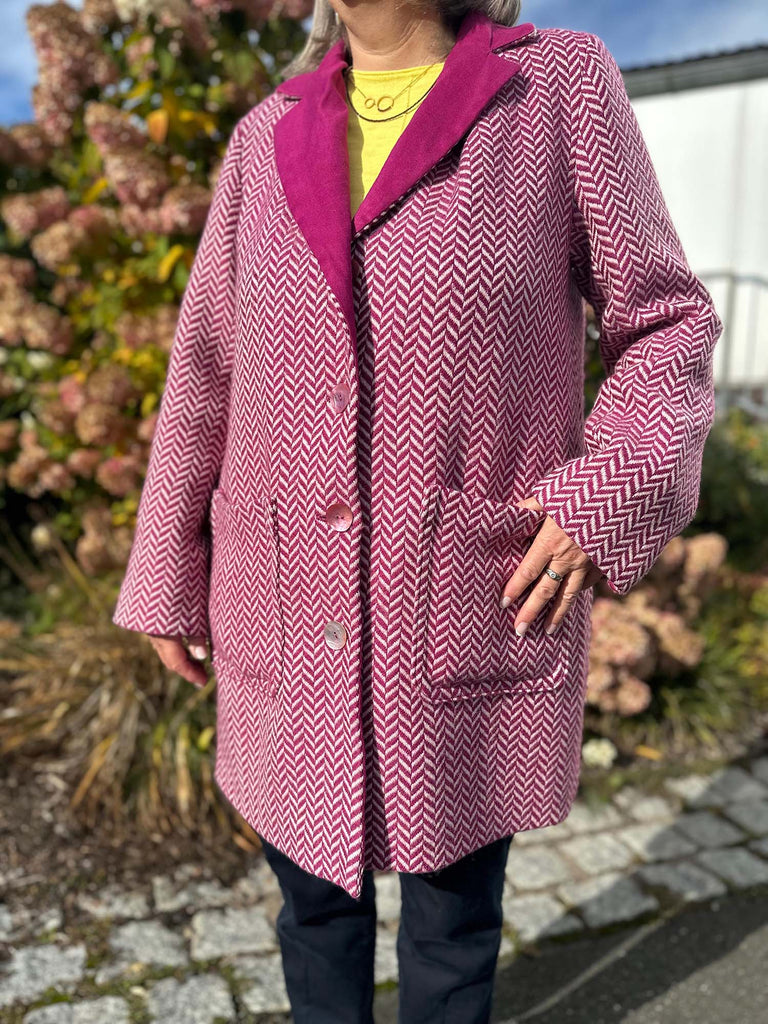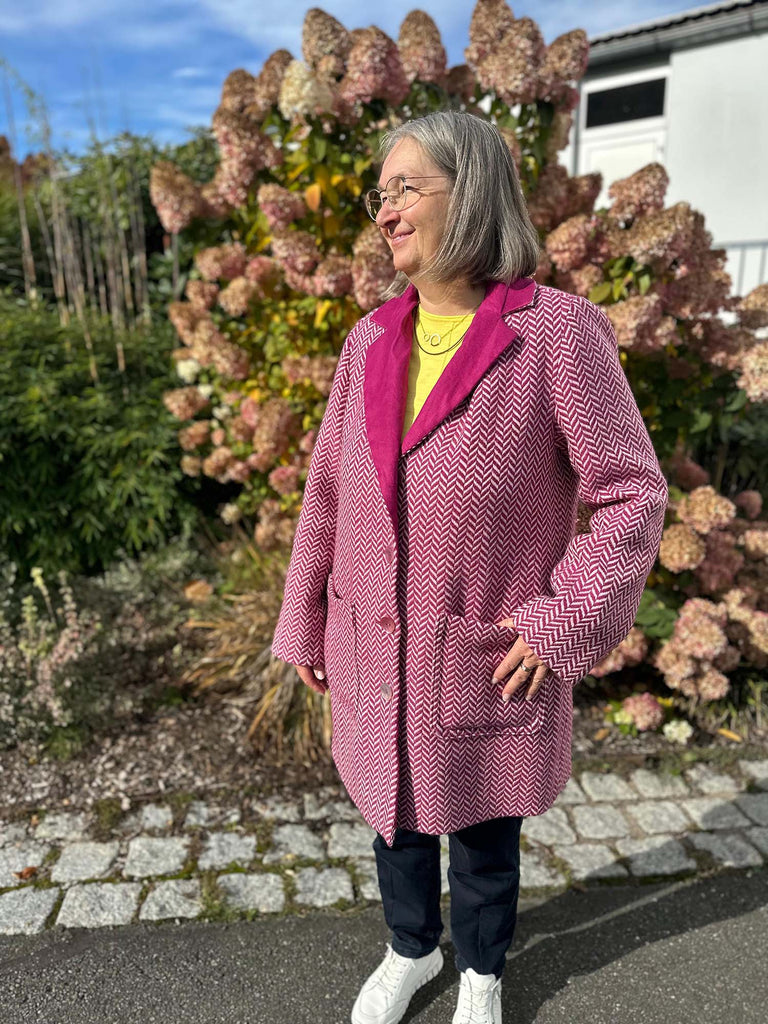 Silke hat den Maxi Fischgrät in der Farbe Beere zu einem Mantel Mona genäht!